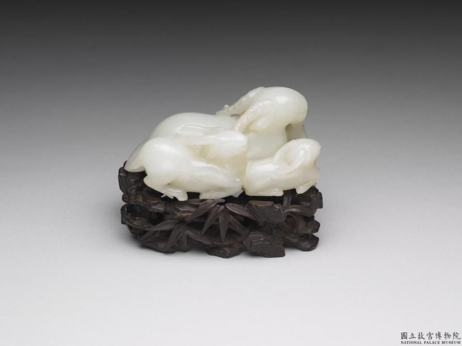 玉质,色莹白微带青色。器立雕一大二小羊只,作跪伏状彼此相依,羊双角、杏眼,颌下有须,造型乃取「三阳开泰」之意。附镂空灵芝竹石木座一。