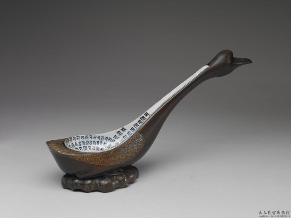 器呈杓形,长柄细长,前宽后窄。全杓内外满釉,但口缘一圈无釉,系为覆烧制成。外壁以青花顺沿杓形,绘饰折枝朵莲二十四朵,杓瓢底心四朵,排列成一菱形,外围十朵;杓柄顶端一朵,下则三朵一组排列成一品字形共三组九朵,外壁口沿下画青线二道为饰。内壁瓢心书一梵文种子字,外围绕梵文种子字五圈,由少至多,杓柄三排横向梵文种子字,中间一行较长,两旁略短。青花釉色浓艳,多处带铁褐或铁黑结晶疵斑,白釉泛青。胎骨轻薄,质坚细致。 梵文种子字又称「一字真言」,「种子」即是以梵文作为诸佛的代称,每一尊佛、菩萨等都有其各自的种子字。明代自永乐开始一直到明末,官窑瓷器上常见以梵文作为装饰,此当与宫廷的宗教活动有关,意为受佛庇护吉祥之义。相同器物除景德镇珠山永乐后期地层曾出土不完整器外,其它并无所见,极为珍稀。此器于清代乾隆时,特为其制作一紫檀木鹅形托座,座为两木接连,上为原木雕挖,雕一鹅蹲坐,下为一翻卷荷叶,全器作鹅蹲坐荷叶状,雕工精巧细致,鹅毛或眼、脚蹼甚至于翻卷荷叶的茎脉线皆刻雕精细,托座鹅背内并刻「乾隆御玩」一行四字楷书及「≡」、「隆」两刻印文,杓器与器座两相辉映。