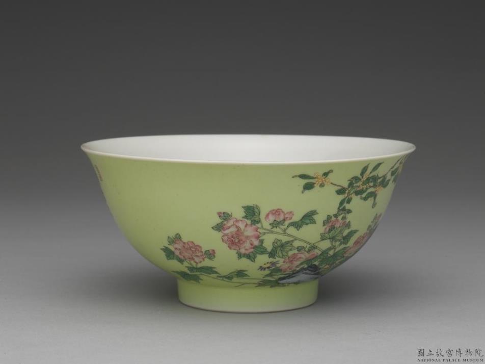 这件碗侈口、深弧壁、矮圈足。器内平素无纹,外壁以绿色为地,一面彩绘奇石一座,其后长有桂树一株,黄色桂花开满枝头。树下另有大朵粉色芙蓉及紫色小野菊恣意盛放。外壁另一面以墨书写有「枝生无限月,花满自然秋」二句,诗句出自唐朝李峤〈桂〉五言律诗之颔联。诗句前有「佳丽」,后有「金成」、「旭映」共三枚红料印。器底带「雍正年制」二行蓝料宋体字双方框款。在显微放大下,可观测到紫菊是以金红玻璃粉末与钴蓝玻璃粉末的混合来呈色,而印文「金」字中柱亦可发现红料析出的金微米颗粒。