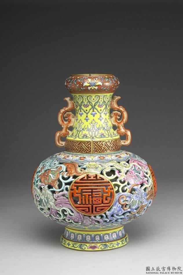 蒜头口,长颈,双夔耳,圆腹,圈足。颈部与圈足以绘图为饰,腹部以镂空及笔绘装饰,口沿金彩绘番莲纹,下颈部饰如意云纹及莨苕叶纹,颈部下缘饰连续卍字不断锦,腹部分列四开光,饰「福寿」二字,开光隙地有多色夔龙及卷云纹环绕,圈足饰莲瓣纹及番莲纹。圈足缘露胎,底施浅蓝釉,中央青花书「大清乾隆年制」六字三行篆书款。
