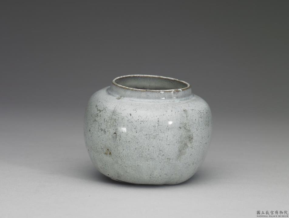水盂,罐式,直口,短颈,矮圆腹,腹部作六瓣瓜棱形,平底,矮圈足。胎骨稍厚,色深褐;器施钧蓝色青釉,并多椶眼,口缘透胎色。器内及底足露胎呈褐色。