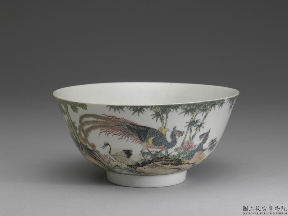 碗侈口,深弧壁,平底,浅圈足。碗外白地一面彩绘凤凰、鹤、鹡鸰、黄鹂、鸳鸯各两只,在有坡石、芙蓉、流水的环境里停栖于竹下、梧桐枝上。所画动植物皆以黑色线条勾勒轮廓,再填色彩,描绘极为细腻,其石头除以轮廓写形外,再画数道线条制造仿如画家画石的皴法,表现石块的质感。碗的另一面则以墨书题写「盛世凤凰应纪历,羽仪四佐协纲常」二句,诗的首尾以红料绘篆体「凤采」、「彬然」、「君子」三枚朱白印文。口沿至碗底有一道裂痕,圈足露胎,碗底有蓝料书「雍正年制」两行宋体款,外加双方框。《孟子‧滕文公上》:「父子有亲,君臣有义,夫妇有别,长幼有序,朋友有信。」此五种关系即称五伦,合观画题与诗文内容,凤凰在《山海经》中描写的形象为「有鸟焉,其状如鸡,五采而文,名曰凤皇,首文曰德,翼文曰义,背文曰礼,膺文曰仁,腹文曰信。是鸟也,饮食自然,自歌自舞,见则天下安宁。」其本身不仅具有五彩之色、五种德性,还可以之象征天下太平,故言「盛世凤凰」,以之为首,其余的动物即鹤、鹡鸰、黄鹂、鸳鸯则任协佐角色。后人画花鸟,常以凤凰、仙鹤、鸳鸯、鹡鸰、莺作五伦图,而此碗双双描绘,或以之象征五伦关系,参照古籍、诗句的描写与动物特性,凤凰应象征君臣、鹤应依《易经‧中孚》九二爻爻辞:「鸣鹤在阴,其子和之」象征父子关系、鹡鸰在《诗经‧小雅‧常棣》:「脊令在原,兄弟急难」,脊令即鹡鸰,飞则共鸣,行则摇尾,有急难相共之意,故比喻兄弟在危急困难之时,还能不顾生死,相互救援,象征兄弟手足之情、黄鹂或以其声取《诗经‧小雅‧伐木》中「嘤其鸣矣,求其友声」来象征朋友、鸳鸯则象征夫妇爱情。此件与故瓷17693成对。