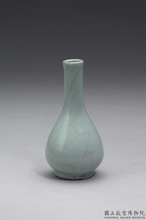 圆口窄边,细长颈,梨形腹,平底,矮圈足。胎骨稍薄,垫烧,施青釉。釉质清亮有光泽,釉面有金黄色纹片。足端无釉,局部露出深灰色胎。整件作品直颈梨形腹的造型特征,和任氏墓出土的青瓷瓶具有若干的相似度,但圈足稍高,修饰不平整的作法又近似南宋官窑器,故将之订年为南宋至元。