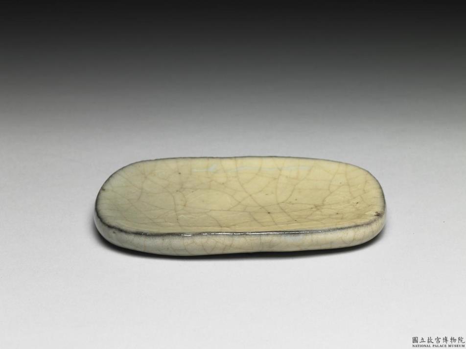 长椭形浅盘,不甚规整,似以泥板略拗其边即成形。器满釉,仅底部七个小支钉痕,露黑胎。釉色不均,由灰青、青黄、至月白色,并有粉青色条状流釉痕;器缘釉薄泛黑。器表有冰裂纹、开片及?眼。器底刻乾隆五十八年(1793)楷铭:『椭片出越窑。较唐宋应久。非盘亦非碟。盛水不盈口。是诚无用器。何以宝同玖。徒因阅岁深。沧桑互珍守。髻垦七钉存。唐宋或弗取。干限癸丑仲春御题。」印︰『比德』、『朗润』。