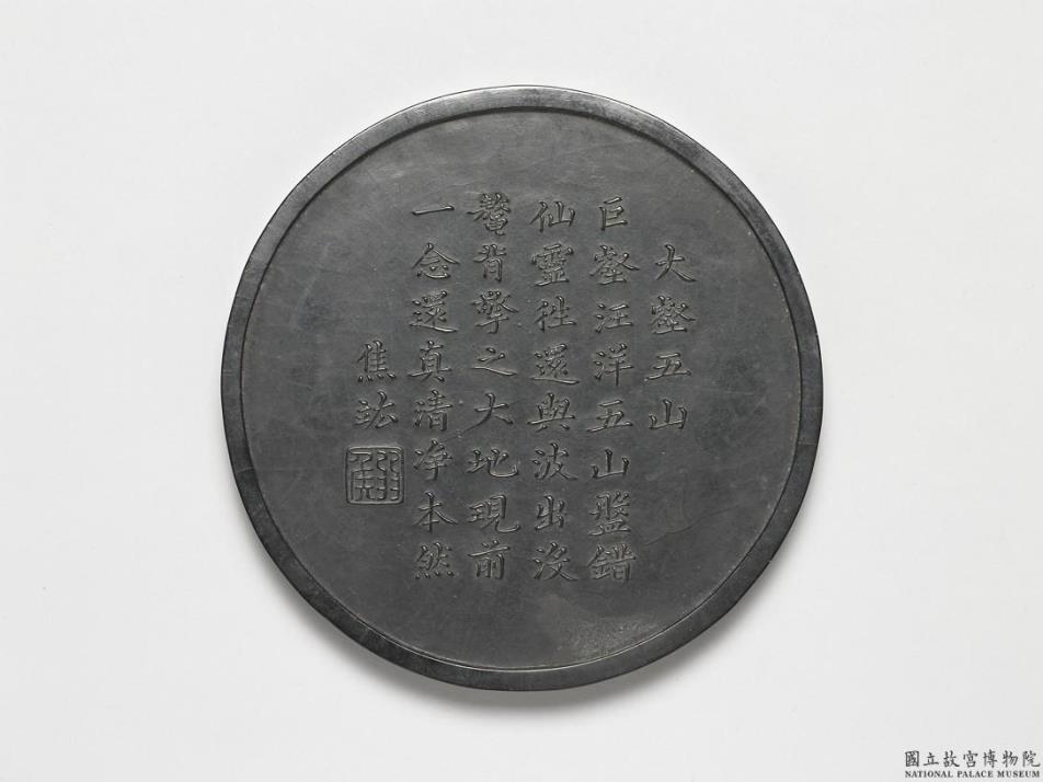 圆形墨,边框起棱,一面模印明代文人焦竑所书〈大壑五山〉铭文,并见模钤「弱候」印记与款识。另面则模印水面上有五座大山,方别位于四角与中央,正合焦竑所书写的〈大壑五山〉铭记。此墨图式见之于明代程君房《程氏墨苑》中,但本墨墨侧只有「癸卯」款而无人名款,又其「卯」字有损伤。