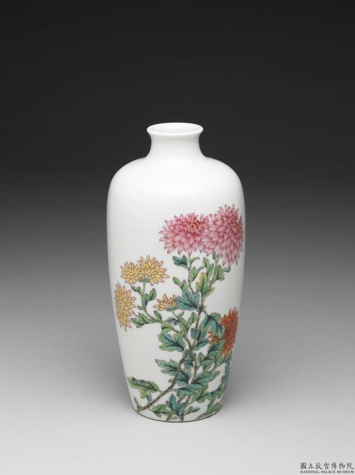 梅瓶造型。通体白釉,一面彩绘四色折枝菊花,一面墨书乾隆御制诗〈冒雨寻菊〉(1733):「秋雨霏霏碧藓滋,闲情今日步东篱。不知冷月寒朝里,开到西风第几枝。」诗文下红彩描书「乾隆宸翰」「惟精惟一」朱白二篆体方印。胎薄透光,底心青花书「大清乾隆年制」六字三行篆款。