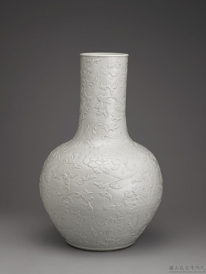 圆口,唇沿,长直颈,斜肩,圆腹,平底。全器外壁与口缘内皆施白釉,贴饰转枝番莲纹与各式花叶纹。圈足露胎,内部施釉。