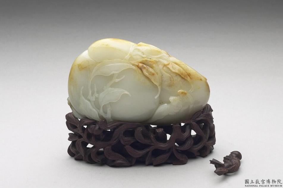 玉质,色灰白,局部有赭斑、烤皮子。器琢双桃相迭之状,底浮雕一老干,连茎侧出,附于桃实之上,桃面琢一对蝙蝠,具有「福寿双全」的吉祥寓意。附雕花枝木座。