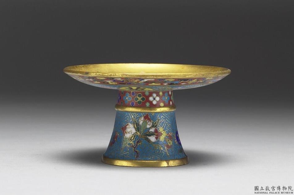 铜胎,掐丝珐琅,高足盘,高圈足外撇。高足与浅盘外皆以红釉、蓝釉亚字为地,红地上有四瓣朵花或云纹间暗八仙,蓝地上则饰佛手、桃实、蝙蝠、花卉等象征长寿多福的吉祥图案,盘外另题「万、寿、无、疆」。足内施蓝色釉,无款。