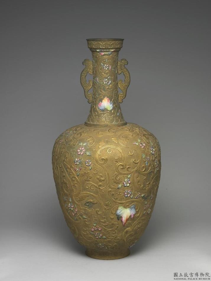 铜胎,内填珐琅,器身镀金。盘口,长颈,硕腹向下微敛,圈足,颈部嵌双螭形板耳。全器以锤鍱法表现线条优美的卷叶纹、围栏图案及缠枝花卉,其中花卉与部分叶片填烧多色釉彩,渐层晕染方式与用色富西洋风格,整体设计高贵优美。器内及底通施珐琅白料,底心墨书「大清乾隆年制」六字楷款,外加双方框。与故珐292一式成对。