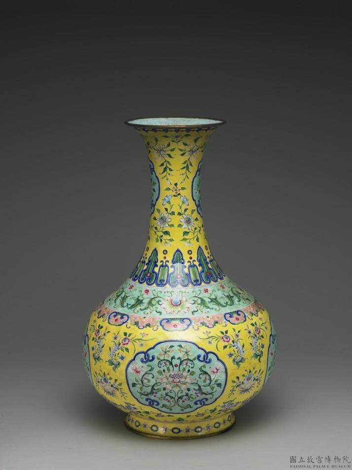 铜胎,侈口长颈,斜肩硕腹,圈足微外撇。全器以画珐琅技法装饰,颈腹均有浅蓝地开光,颈开光绘折枝花,腹开光绘番莲花叶纹,颈腹交界处并有一圈浅蓝地缠枝番莲纹,上下分别有变形蕉叶纹与如意云头纹一圈,除此之外,器壁均以黄地花卉纹为饰。