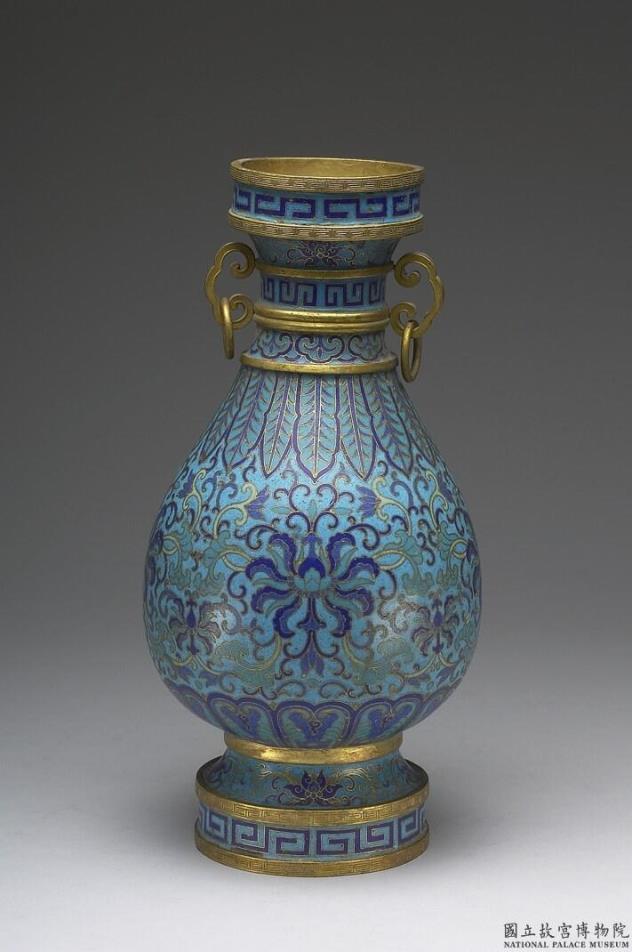 铜胎掐丝珐琅,直口,短颈,双如意带环耳,斜肩,圆腹,高圈足。器表以浅蓝釉为地,图案部分填以深蓝色与浅绿色釉,口缘与圈足为回纹及番莲花纹,颈部饰回纹及如意云纹。肩部为蕉叶纹,中央为番莲花纹,下方为莲瓣纹。底部露胎。与故珐400为一对。
