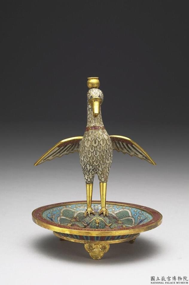 铜胎,掐丝珐琅,承盘脱落。烛台,由倒三阶式承盘、海燕与盘座组成。盘内壁掐丝作江水波涛,上饰龟蛇合体的玄武,龟背上立展翅海燕,燕身白有红颈圈与黑尾,掐丝羽纹浓密细致,燕顶作靛蓝、绿、红三色饰连续曲线纹烛台。盘底中心露胎,阴刻楷款「乾隆年制」,本器一式成对(与故珐444),共收于有题款为「乾隆年制铜胎掐丝珐琅海宴河清书灯一对」木匣中。海宴河清典出《幼学琼林》「海不扬波,知中国有圣人」,表示天下太平之意。