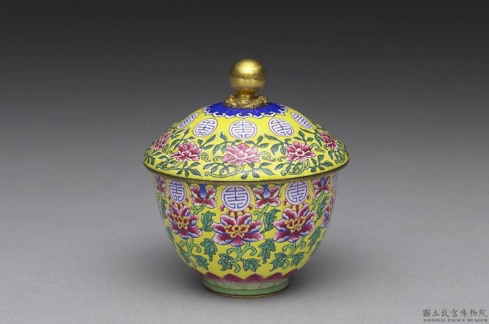 铜胎。带盖小杯,侈口,深弧壁,圈足,穹顶式盖,盖上有圆球钮。全器外施黄釉为地,器与盖各绘桃红色折枝花与缠枝花一圈,花朵上方延伸出团寿字装饰,盖钮下方周饰云纹;器底周饰几何莲瓣纹。器内施蓝色釉,底有蓝色双方框墨书「雍正年制」楷款,下接托盘成组(故珐489)。