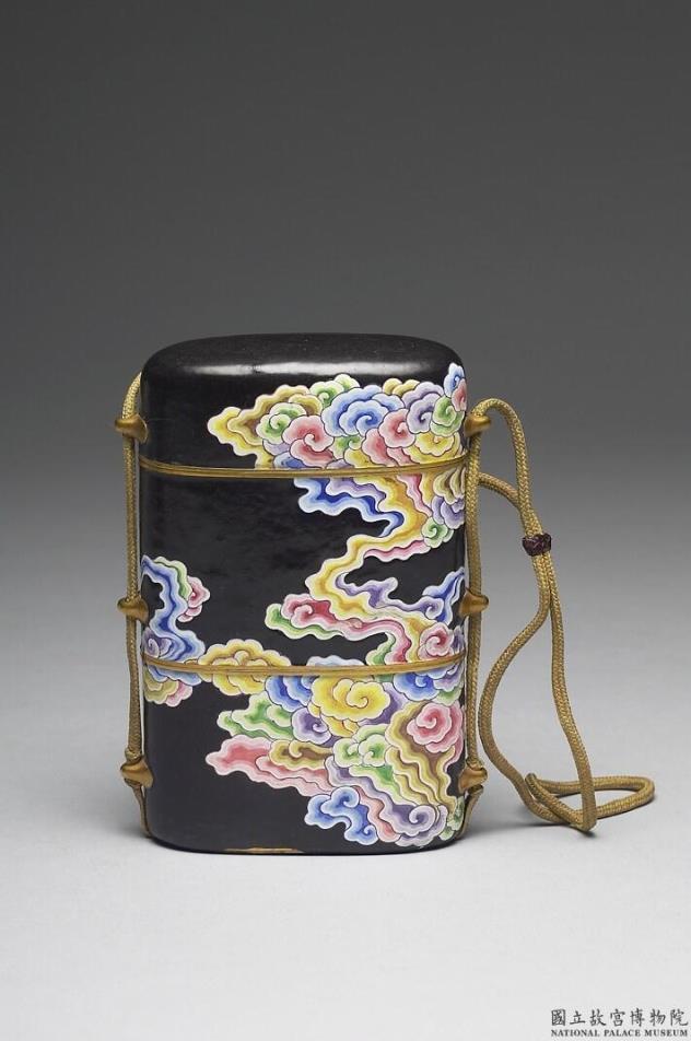铜胎。椭圆式双层盒,子母口,直壁,盖与器侧附穿钮,有黄绦贯穿。器身黑地上绘五彩祥云,光洁亮丽的黑釉将深浅多彩云气流动衬托得更明艳生动。盒内施蓝釉,黑釉底中心有白地双螭红框,内蓝书「雍正年制」楷书款。