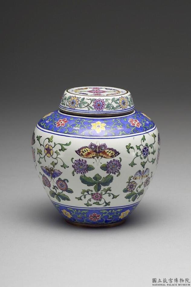 铜胎。口微敛,圆肩,敛腹,圈足,带盖。器内施蓝釉,器表白地,腹部绘有蝴蝶、花卉,上下各绘有一圈蓝地花卉纹;盖面中央为一朵菊花,外圈为花卉与蝴蝶相间,盖沿绘有一圈缠枝花卉纹,盖面及盖边花卉之花心部分皆镶嵌金座托宝石。底白地墨书「乾隆年制」双圆蓝框楷款。