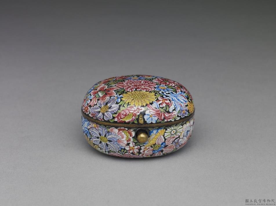 椭圆形掀盖铜盒。器表通体先上一层白色底釉, 再以红、黄、蓝、白等色满绘向日葵、水仙、雏菊等百花, 余填黑色地釉。盒内罩浅蓝色釉, 盖沿写「雍正年制」(1723-1735)单行黑料楷书款。纹饰设计与光影点染, 深受西洋风格影响。