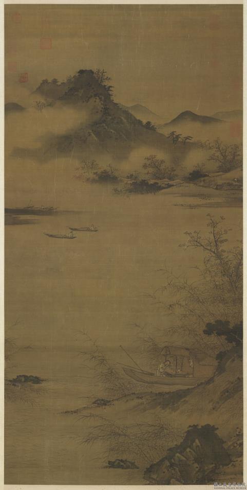 一河两岸式构图的浅设色画。画岸侧渔舟方舣楫,对浦渔船三两,而红叶风芦正展现一片盎然秋意。 清宫〔石渠宝笈〕将本幅著录为宋人之作,然学者却从画幅的右上角发现属于明代江右(今江西)画家丁玉川的钤印一方,印文为「玉川」二字。丁氏的生卒年不详,约活动于十五世纪,其山水画宗法宋代马远、夏珪,正与本幅画风相符,因推断丁玉川可能为原作者。