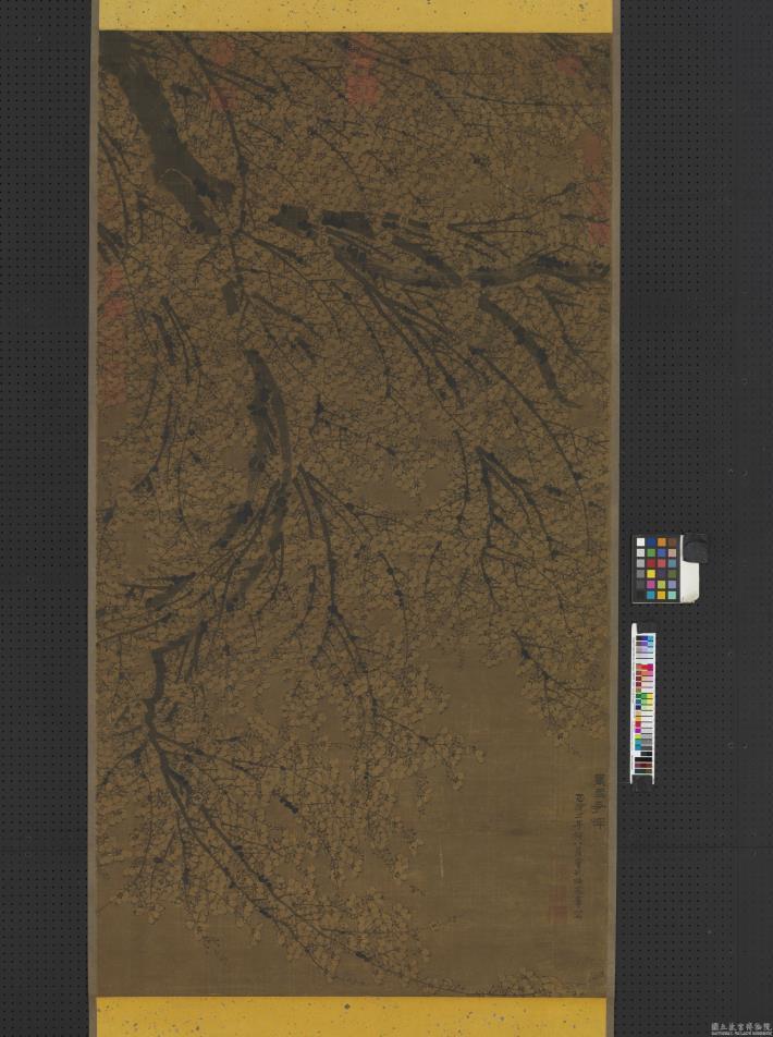 陈宪章,活动于明英宗正统(公元一四三六-一四九九年)年间,浙江会稽人。善于画梅花,画史中对他的记载,仅说他和同时的王谦齐名。这一幅作品画横垂的梅花,分出的二枝主干,均用浓墨画出。梅花的部分,则以圈瓣的方式来表现,然后用淡墨全面的渲染绢底,更衬托出花瓣的白。整幅画的不是梅花的清,而是梅花的密,千花万瓣中,呈现出一片花团锦簇的热闹景象。
