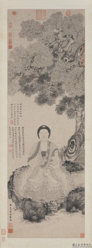 丁云鹏(约公元十六世纪末期至十七世纪初期),安徽休宁人,字南羽,号圣华居士。善画佛道人物。画法学唐吴道子,又白描法学北宋李公麟,用笔勾勒,线细如发丝,而眉睫间,尚能意态毕具。 本幅画释迦牟尼坐树下,容貌端静,宛若入定。通幅全用墨笔勾染,不着颜色。予人有真幻两忘,神入华严净土之感。