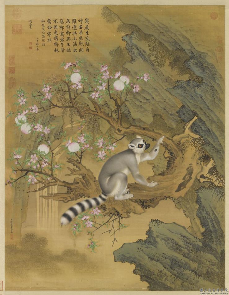 朗世宁(公元一六八八-一七六六年),意大利人,耶稣会教士,以绘画供奉内廷。历仕康熙、雍正、乾隆三朝。画法参酌中西。 成画于乾隆二十六年(公元一七六一年),这幅画绘制的可能是产于马达加斯加岛附近的环尾狐猴。但是画上乾隆却指称其为来自交趾(现在越南)的果然兽。原产于印度洋的环尾狐猴是否有可能经由越南的进贡来到清廷呢?有待考察。