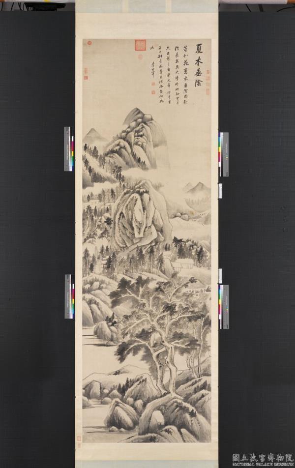 董其昌(1555-1636),江苏华亭人。字玄宰,号思白。万历十七年(1589)进士,官至礼部尚书。画山水宗法五代董源、巨然,并集宋元诸家之长,而成自家风貌。笔墨爽朗潇洒,秀润苍郁,别有风格。收藏甚丰富,又兼擅书法,精于赏鉴。近景画两树擎立,占画面三分之一;隔岸主峰双层迭峙,其间穿错着林木、山岚、屋宇、流泉,起伏有势,层层远去,构图简明而气概雄伟。画中山树用笔抑扬提顿,全从书法中得来,婉转灵动富变化。用墨浓淡燥湿,层次很多,为董其昌传世画迹中的巨幅佳作。董其昌《画眼》论画山云:「山不在多,以简为贵。」又说:「古人运大轴,只三四大分合,所以成章。」强调如何掌握山川气势,并舍弃细碎繁琐,以符合北宋阔重恢弘的胜概。董其昌这些见解,从这幅作品中可以看到他理论与创作的密切结合。画上董其昌自题云,曾经在长安吴太学家中,见到董源的〈夏木垂阴图〉后,认为黄公望虽然受董源影响,却青出于蓝,不必让古人专美于前。并且又谦虚引述米芾的话,说自己的绘画理论胜过笔下工夫。(许郭璜)