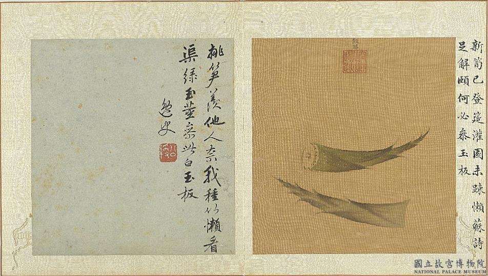 左方裱绫清仁宗楷书御题:「新笋已登筵,灌园未踈懒;苏诗足解颐,何必参玉板。」对幅姚公绶题跋:「挑笋羡他人,奈我种竹懒;看渠绿玉茎,参此白玉板。逸史。」