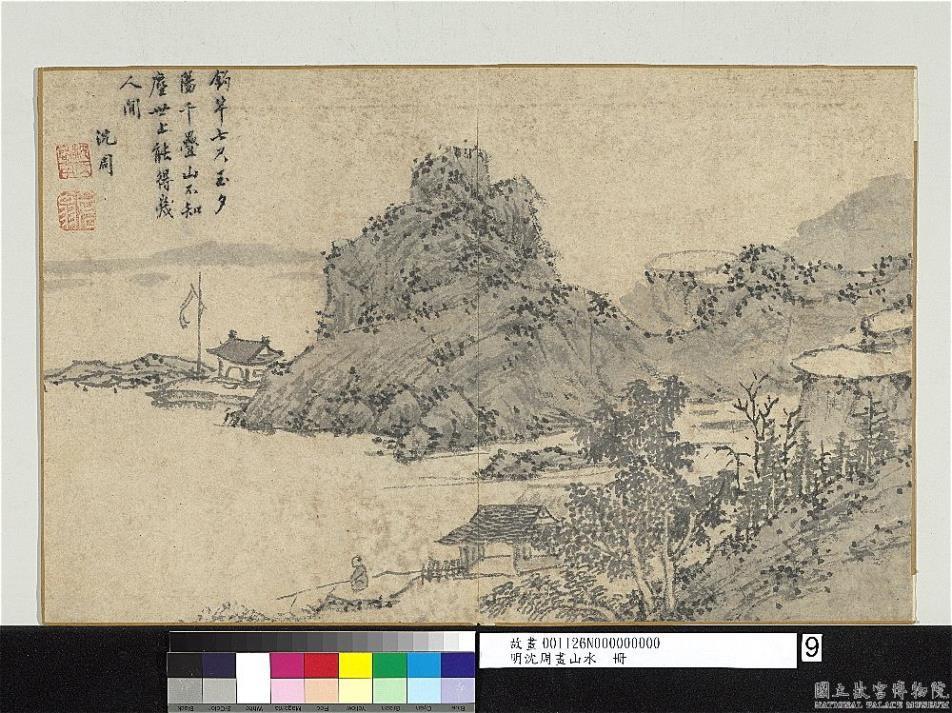 钓竿七尺玉。夕阳千迭山。不知尘世上。能得几人闲。沈周。