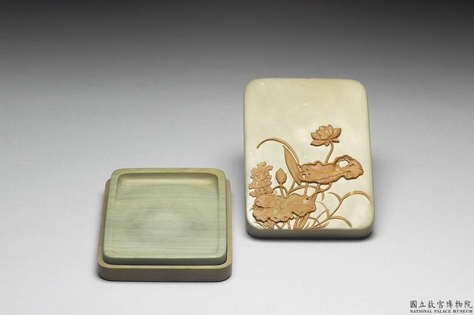 淡绿色方形砚,微泛黄,砚面周边起棱,ㄇ形池。石质润泽,通体有深浅不同之绿色天然横纹,砚面留一较粗之椭圆形墨堂,且尚留墨痕,余皆打磨光滑。砚背周边起宽棱,中央凹下处阴刻行书铭:「以静为用,是以永年。」并阴刻二行四字篆体方印:「雍正年制」。淡绿色方形砚盒,盒盖与盒身藉砚身扣合。盒身呈淡绿色,盖面浮雕土黄色荷塘图,荷花二株,一含苞,一盛开;荷叶三片,二片已残,一片尚卷,残叶中一叶向阳,一叶之边略卷,卷叶与卷边皆双勾浅浮雕叶脉,正面者阴刻叶脉,荷叶间尚有水草错落其间。盒背周缘起一圈宽棱,表面有一层褐黄色涂料。故文244乾隆朝的松花石荷塘砚,其盒盖纹饰与此件构图相似。
