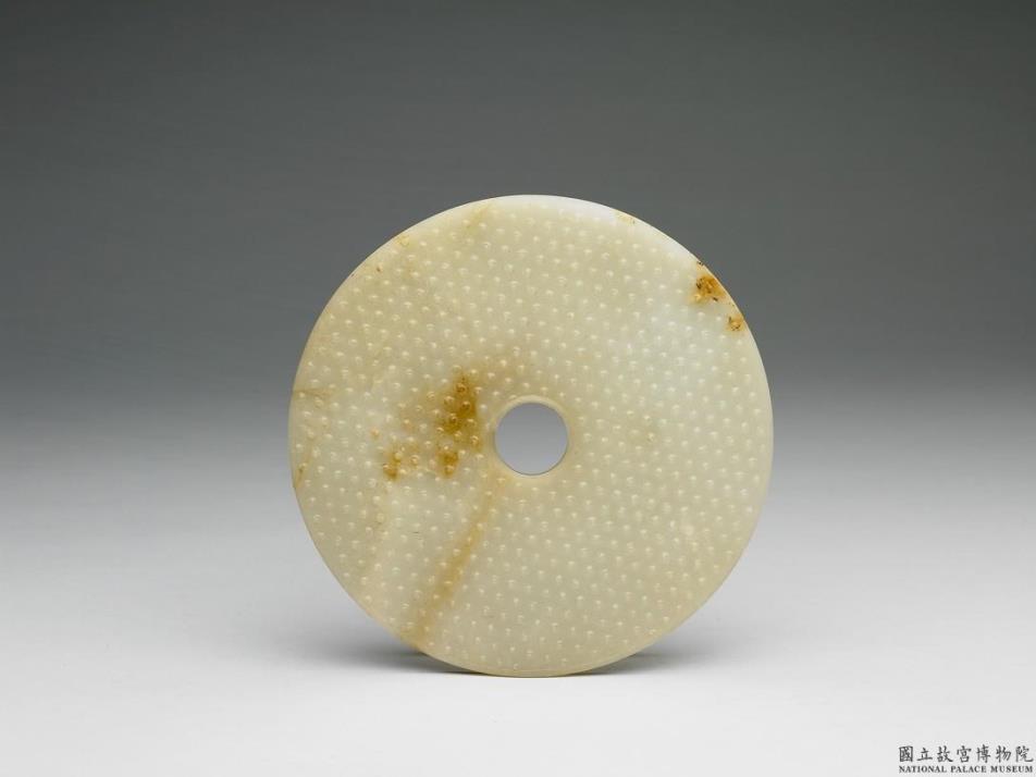 白玉璧,局部微有黄斑。全器呈圆璧形,外缘规整。孔径略小。两面均浮雕谷纹。