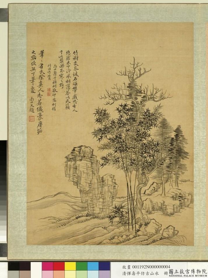 竹树交参。坡石映带。我思古人。悠然来下。冷风相荡。答以天籁。于此盘游。岑寥之野。南田寿平。橅柯敬仲乔柯修竹。因作赞。