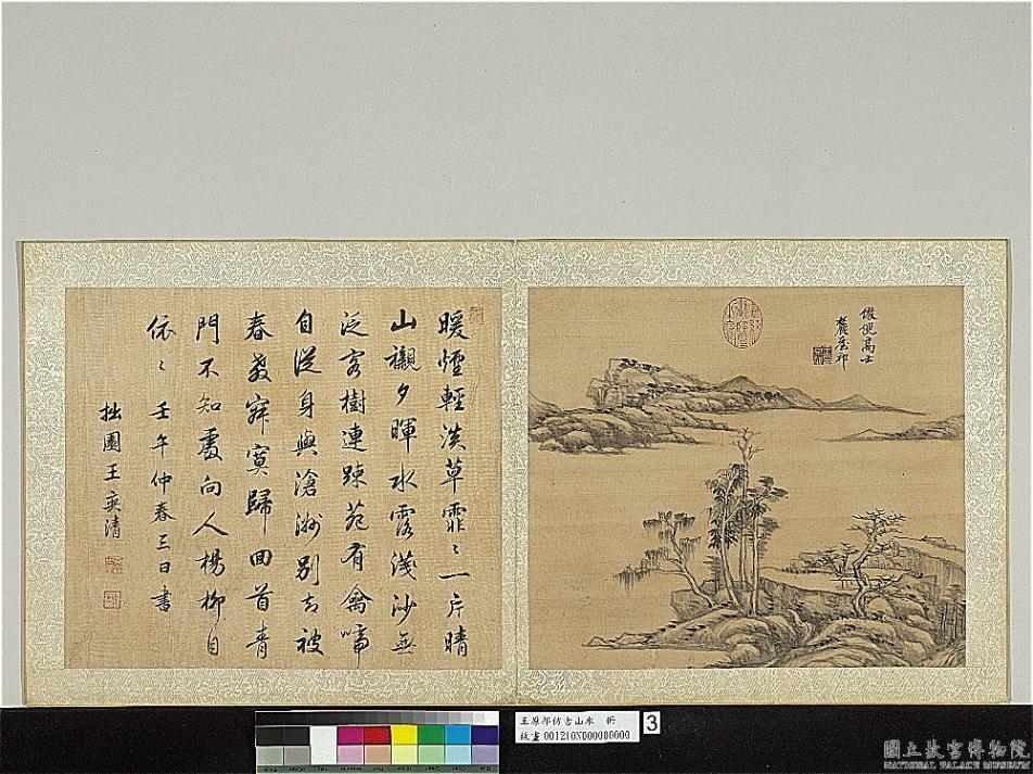 暖烟轻淡草霏霏。一片晴山衬夕晖。水露浅沙无泛客。树连疎苑有禽啼。自从身与沧洲别。却被春教寂寞归。回首青门不知处。向人杨柳自依依。壬午仲春三日书。拙园王奕清。