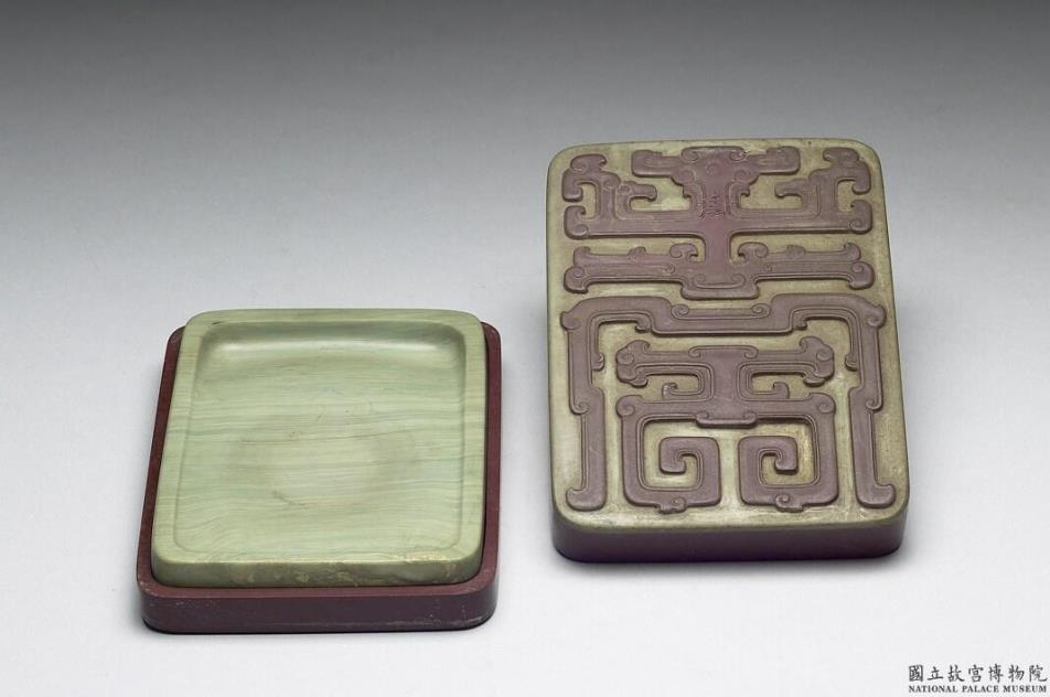 长方形石砚,色灰绿有多层次绿色丝纹。周起边框,砚池斜下,面作略凹圆形成砚堂,中有使用痕,光素无纹饰。砚背中央剔地,阴刻「以静为用,是以永年」,并钤「雍正年制」篆印。有紫色夹绿色松花石砚盒一。