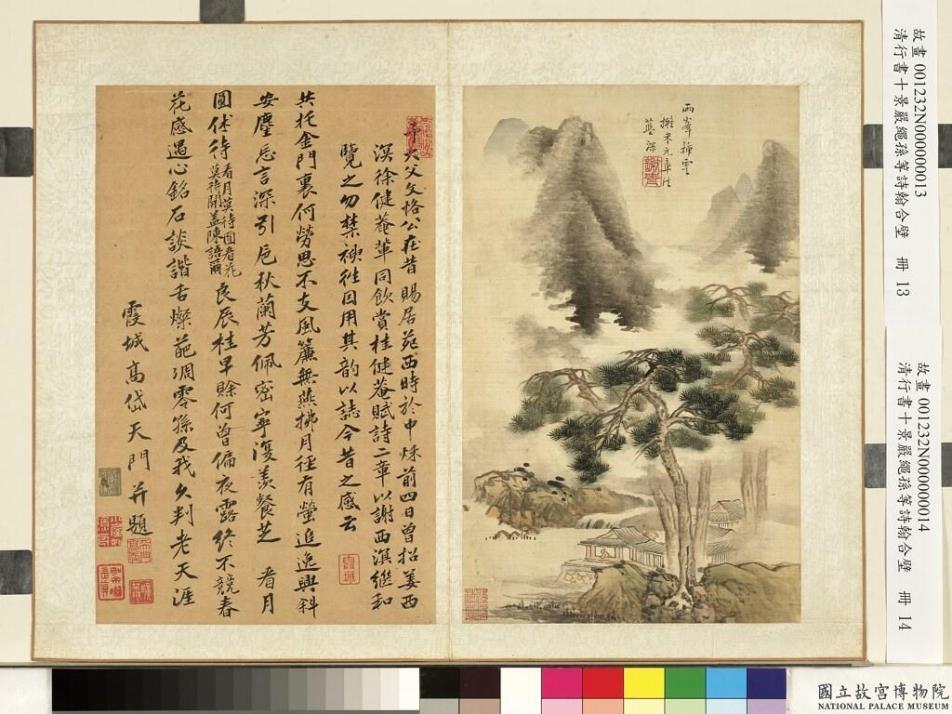 清蓝深画西湖十景严绳孙等诗翰合壁 册 两峰插云高岱行楷书
