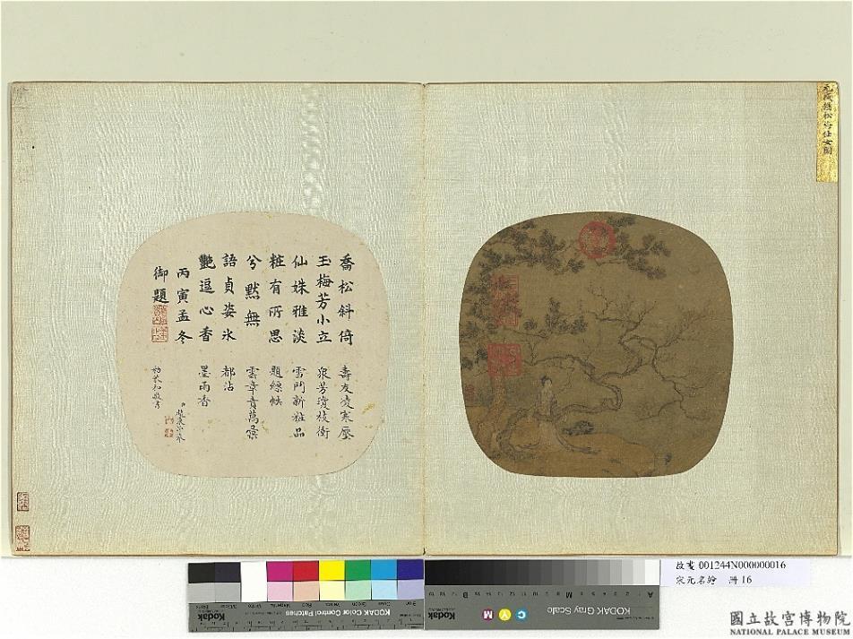 乔松斜倚玉梅芳。小立仙姝雅淡妆。有所思兮默无语。贞姿氷艳逗心香。丙寅(公元一七四六年)孟冬御题。