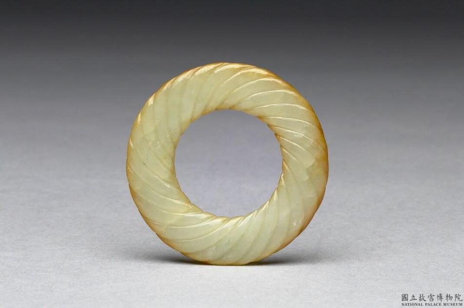 玉质,边缘略呈褐色。小玉环多为组玉佩的组件,此件形制略显扁平,而且孔径占全体比例较小,因此制作环绕一周的扭丝纹时,外圆周的扭丝纹间距会明显大于中孔圆周的间距,这是春秋晚期扭丝纹环常见的特征,但其他时代也偶见此种特征的玉环。
