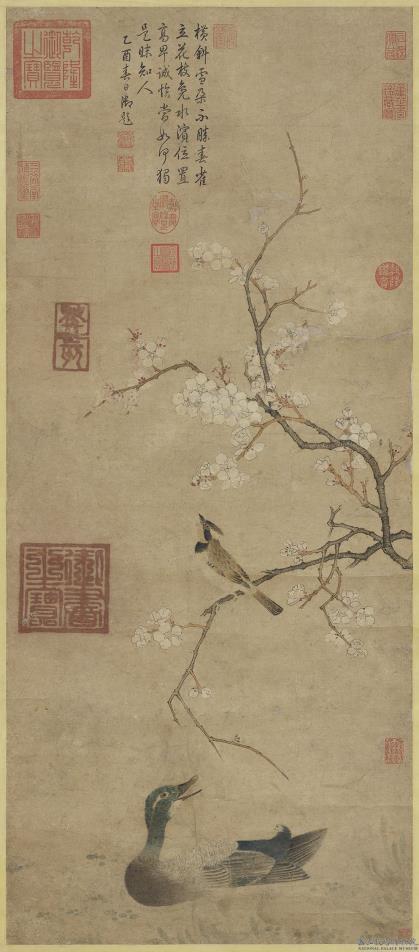 横斜雪朵不胜春。雀立花枝鳬水滨。位置高卑诚恰当。如何独是昧知人。乙酉(公元一七六五年)春日御题。