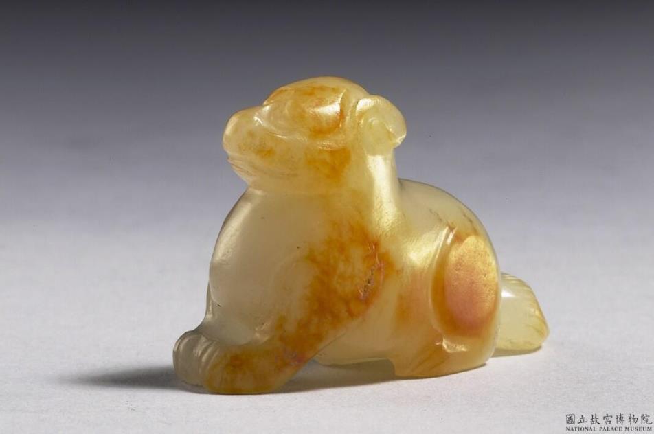 玉质,杂浅赭斑。全器立雕蹲狗,昂首前视,前足直伸,姿态稳重。