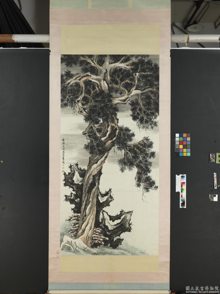 画擎天巨柏一株,下作二石,盖取其谐音一百(柏)二十(石)寿之意。