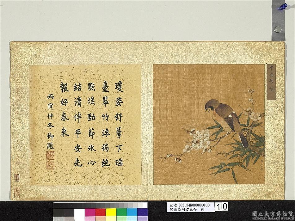 琼姿舒萼下瑶台。翠竹浮筠绝点埃。劲节冰心结清伴。平安先报好春来。丙寅(公元一八0六年)仲冬御题。