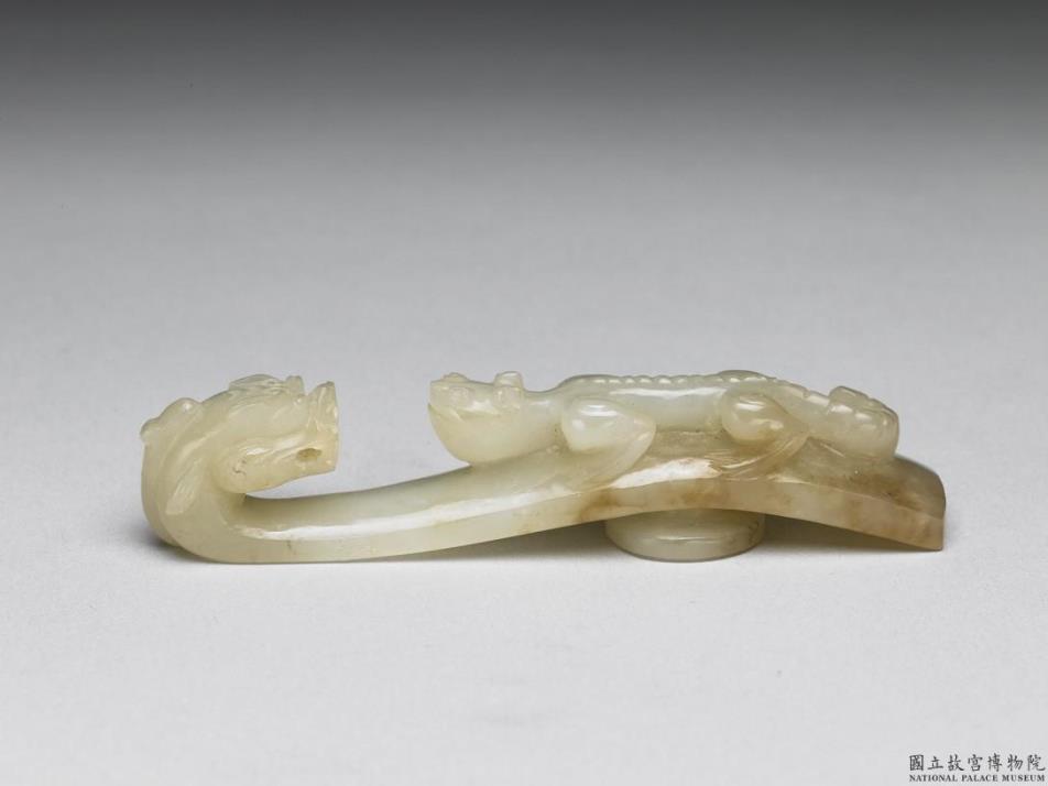 玉质,有黄赭斑。钩作龙首形,面琢浮雕蟠螭,底有圆柱。