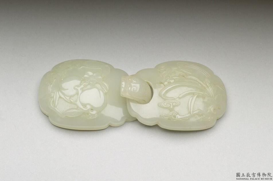 玉质,作成四瓣海棠形,一作钩,一作环,两者背面皆有突起圆钮,用来固定于革带上,钩环相扣,即可束系腰带。钩饰以桃、水仙,环饰以灵芝、水仙,灵芝、水仙、桃的图案组合有「芝仙祝寿」之吉祥寓意。