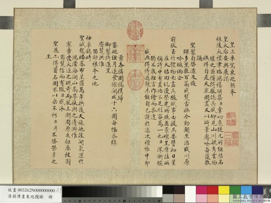 皇上车驾东巡。躬奉皇太后安舆展谒祖陵。大礼聿昭。鸿禧骈集。臣幸叨扈从。凡所经历名胜之区。备得敬志其盛。仰见山川毓秀。云物焕祥。自是天然图画。又以珥笔赓吟。每获敬诵圣制。自启途及旋跸。多至数百篇。或览古抚今。动关至治。或川原吟眺。缅企前猷。至于体物必尽其微。赋事必提其要。譬如日星在天。昭回糺缦。荣光所照。丽景灿呈。摩诘所称。诗中有画。殆不足形容万一也。臣深惭腕弱。不敢轻言作绘。而恭逢盛典。得侍游观。未能自已。谨于途次毡帐中。即景各构图稿携归。銮回经月。退食余闲。成十六图。每幅恭录御制诗。进呈睿览。洪惟留都根本之地。神皋鹄峙。圣域龙蟠。?布星罗。万年拱护。天施地设。开气运于鸿蒙。海阔山高。孕扶舆之清淑。惟宸章发大造之瑰奇。而风土溯周原之巨丽。披图省览。信而有征。臣感沐圣恩。亦得署名图末。以垂不朽。臣溥不胜荣幸之至。