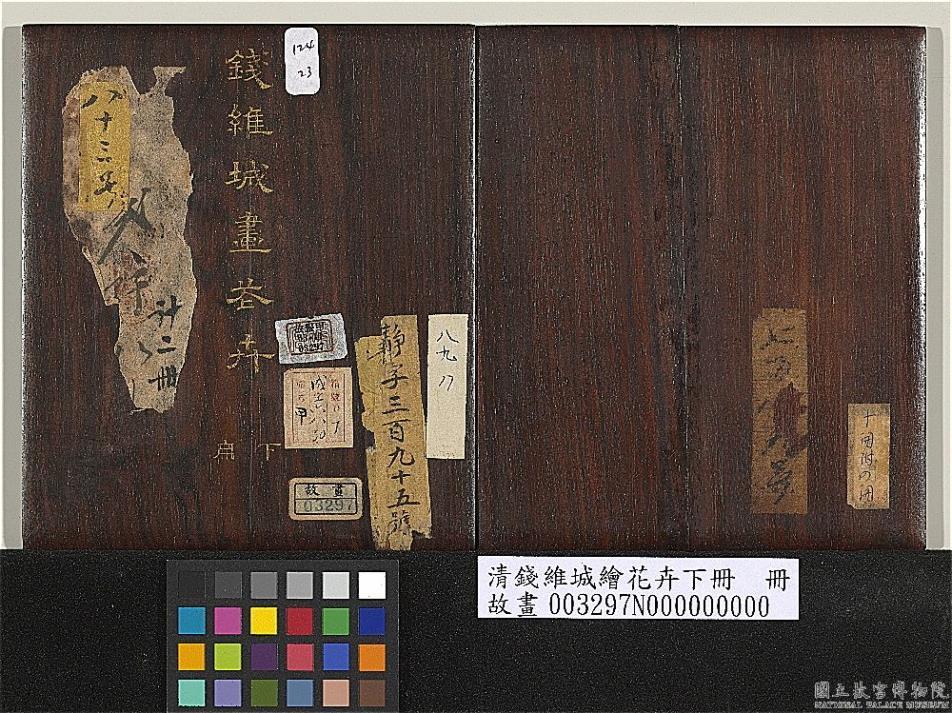 钱维城(公元一七二○-一七七二年),字宗盘,号茶山,江苏武进人。乾隆十年(一七四五)状元,官至邢部侍郎。早年曾随陈书学画花卉,后来又精研山水,为当时宫中画苑领袖。此册为设色写意花卉,笔致深得陈书精髓;而花、叶以色料直接点染之处,亦见清初大家恽寿平的影响。各幅中均有乾隆帝与作者唱和的题诗,既为诗书画一体的雅趣呈现,亦是君臣和乐融融的表征。