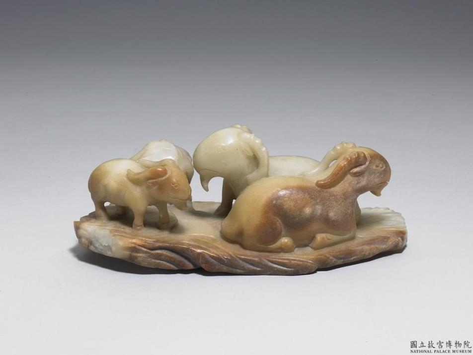 玉质,带赭黄斑。全器雕缓坡上的三只羊,或坐或立,有「三羊开泰」之寓意。