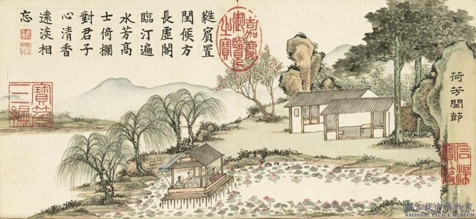 蕤宾置闰候方长。虚阁临汀遍水芳。高士倚栏对君子。心清香远淡相忘。