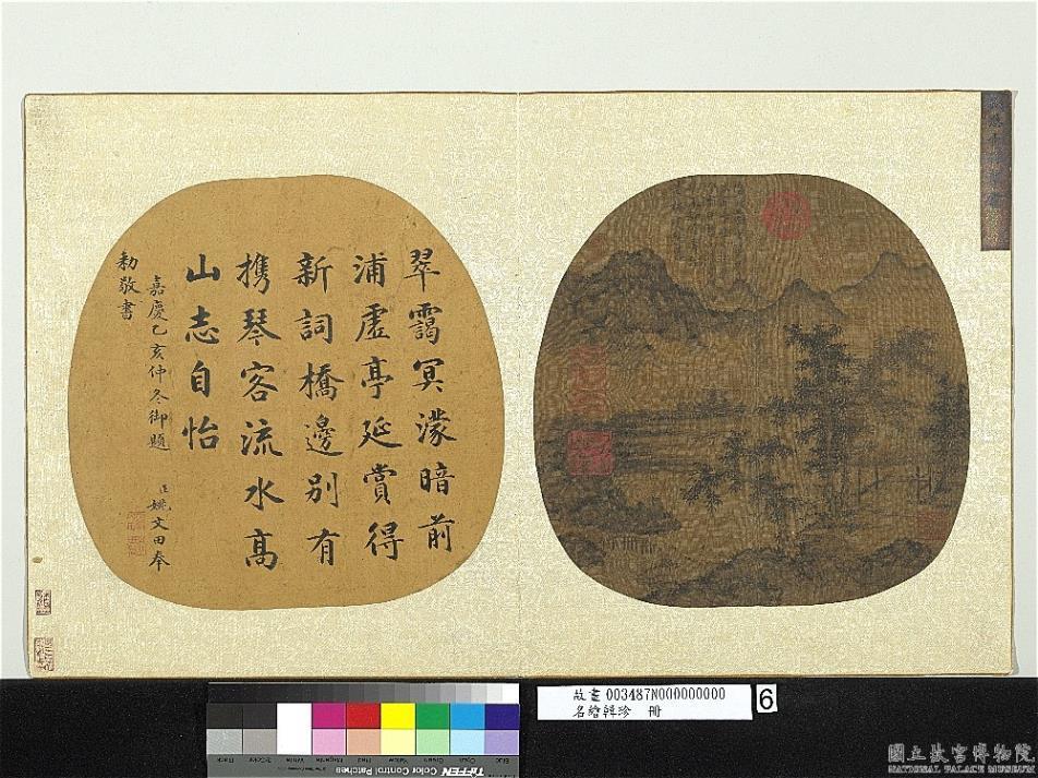 翠霭冥蒙暗前浦。虚亭延赏得新词。桥边别有携琴客。流水高山志自怡。嘉庆乙亥(公元一八一五年)仲冬御题。臣姚文田奉敕敬书。