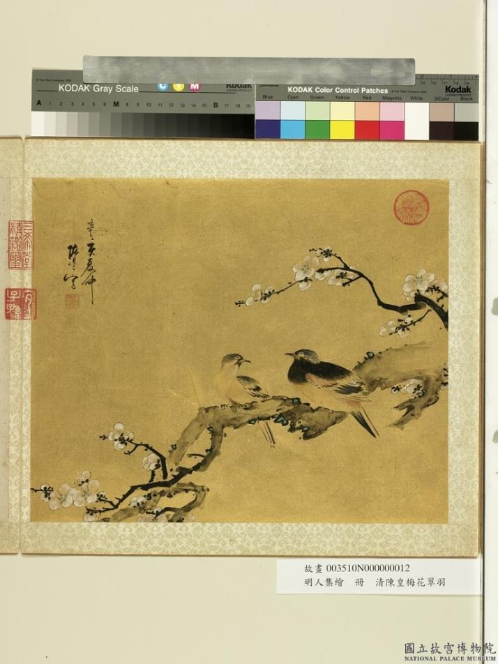 画白梅山雀,钩染二法并用。特以浓墨出枝,再上罩汁绿。笔点极具蓝瑛笔意,复加其嵌色苔点。