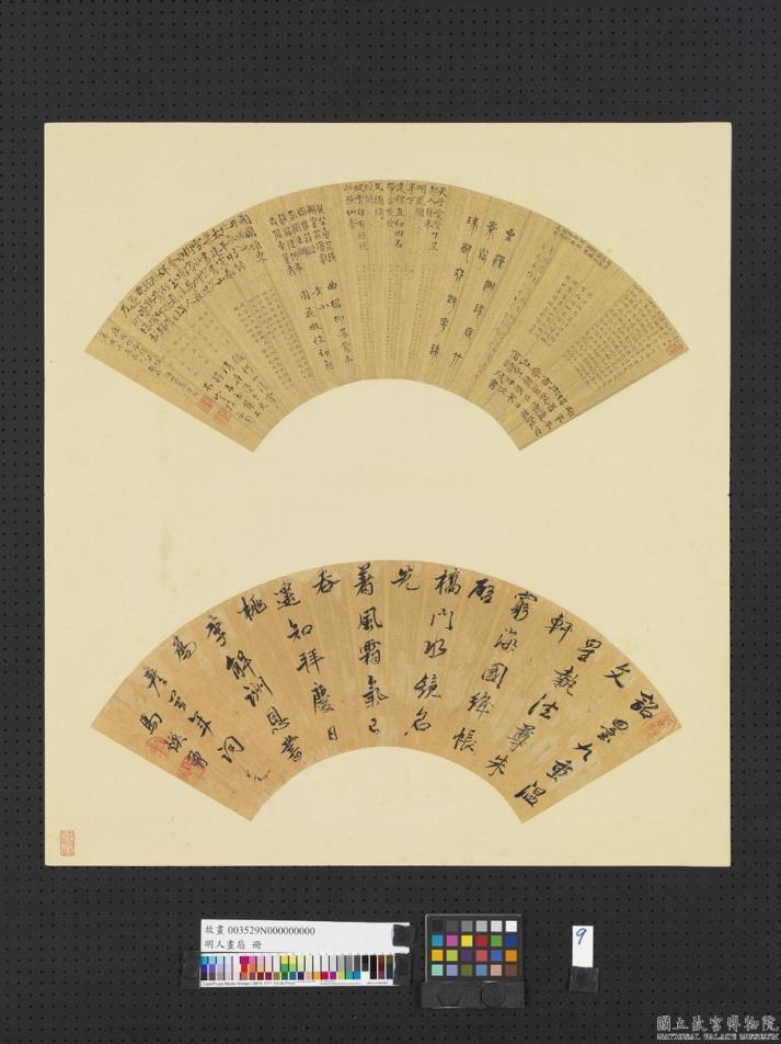 (第一则)羽林十二将。罗列应星文。霜仗悬秋月。霓旌卷夜云。严叟千户肃。清乐九天闻。日出瞻佳气。葱葱绕圣君。东壁图书府。西园翰墨林。诵诗闻国政。讲易见天心。位窃和羹重。恩叨醉酒深。载歌春兴曲。情竭为知音。北斗挂城边。南山倚殿前。云标金阙回。树杪玉堂悬。半岭通佳气。中峰绕瑞烟。小臣持献寿。长此戴尧天。忽报南昌令。乘骢入郡城。同时趋府客。此日望尘迎。文苑台中妙。冰壶幙下清。洛阳相去远。犹使故林荣。(楷书)。(第二则)芳屏画春草。仙杼织朝霞。何如山水路。对面即飞花。(楷书)。(第三则)渡江秋色里。诗兴与归心。客路缘枫岸。家人扫橘林。潮声当昼起。山翠近南深。几日华阳洞。寒花独自寻。(楷书)。(第四则)邵平瓜地接吾庐。榖雨干时偶自鉏。昨日春风欺不在。就床吹落读残书。(隶书)。(第五则)金殿当头紫阁重。仙人掌上玉芙蓉。太平天子朝元日。五色云斗驾六龙。(草书)。(第六则)星汉渐迻庭竹景。露珠犹缀野华迷。(篆书)。(第七则)天子爱贤才。星郎入拜来。明光朝半下。建礼直初回。名带含香发。文随绮幙开。披云自有镜。从此照仙台。(楷书)。(第八则)年光竹里遍。春色杏间遥。烟气笼香阁。流文荡画桥。飞花随蝶舞。艳曲伴莺娇。今日陪欢豫。还疑陟紫霄。圣德超千古。皇风扇九围。天回万象出。驾动六龙飞。淑气来黄道。祥云覆紫薇。太平多扈从。文物有光辉。令节三秋晚。重阳九日欢。仙杯还泛菊。宝馔且调兰。御气连霄近。乘高宇宙宽。今朝万寿别。宜向曲中弹。公子正邀欢。林亭春未阑。攀岩践苔易。迷路出花难。牕覆垂杨暖。阶侵瀑水寒。帝城归路直。留兴接鹓鸾。(楷书)。(第九则)中禁仙池越凤凰。池边词客紫薇郎。既能作颂雄风起。何不时吹兰蕙香。(古文)。(第十则)曲槛柳浓莺未老。小园花嫩蝶初飞。(行书)。(第十一则)开国惟东井。城池□北辰。载歌太平日。共乐建寅春。雪尽青山树。水开黑水滨。艹迎金埒马。花伴玉楼人。鸿渐看无数。莺歌听欲频。何当遂荣棹。归及柳条新。(行书)。(第十二则)帝京元已足繁华。细管清弦七贵家。此日风光谁不共。纷纷皆是掖垣花。(楷书)。(第十三则)公门世业昌。才子冠裵王。出自平津邱。还为吏部郎。神僊余气色。列宿助炎辉。夜道南宫静。朝趋北禁长。时人窥水镜。明主赐衣裳。翰苑飞鹦鹉。天池待凤皇。承欢俦日顾。未纪后时祥。去去图南远。吾才幸不忘。(隶书)。(第十四则)秋河一滴露。清夜坠玄天。将来玉盘上。不定始知圆。(行书)。(自识)唐句作合锦式。似萃老年道长兄教正。海虞严学阔。(楷书)。
