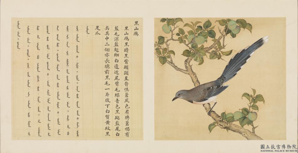(汉满文)黑山鹧。黑山鹧。黑睛黑觜。头颈至背俱苍灰色。肩膊苍褐有蓝毛。深蓝翅。缃白边。近尾背毛缥青色。黑斑蓝尾白尖。其中二翎亦长臆。前黑毛一片。腹下白质黄纹。黑足爪。